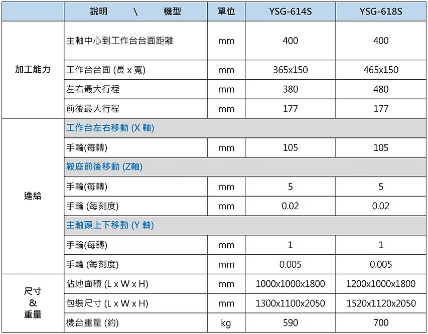 平面磨床鞍座系列手動系列-平面磨床工作台YSG- 614S / 618S平面磨床工作台 (長 x 寬) /YSG-614S: 365mmx150mmYSG-618S: 465mmx150mm機台特點 /■ 精度工作台面精度保證(試磨片x6片,其高度差) : 2μ上下軸進刀最小單位 : 5μ■ 主軸及馬達2HP V3級低震動主軸動馬達精密主軸採套筒式,ABEC Class 7 (P4) 軸承,0.0