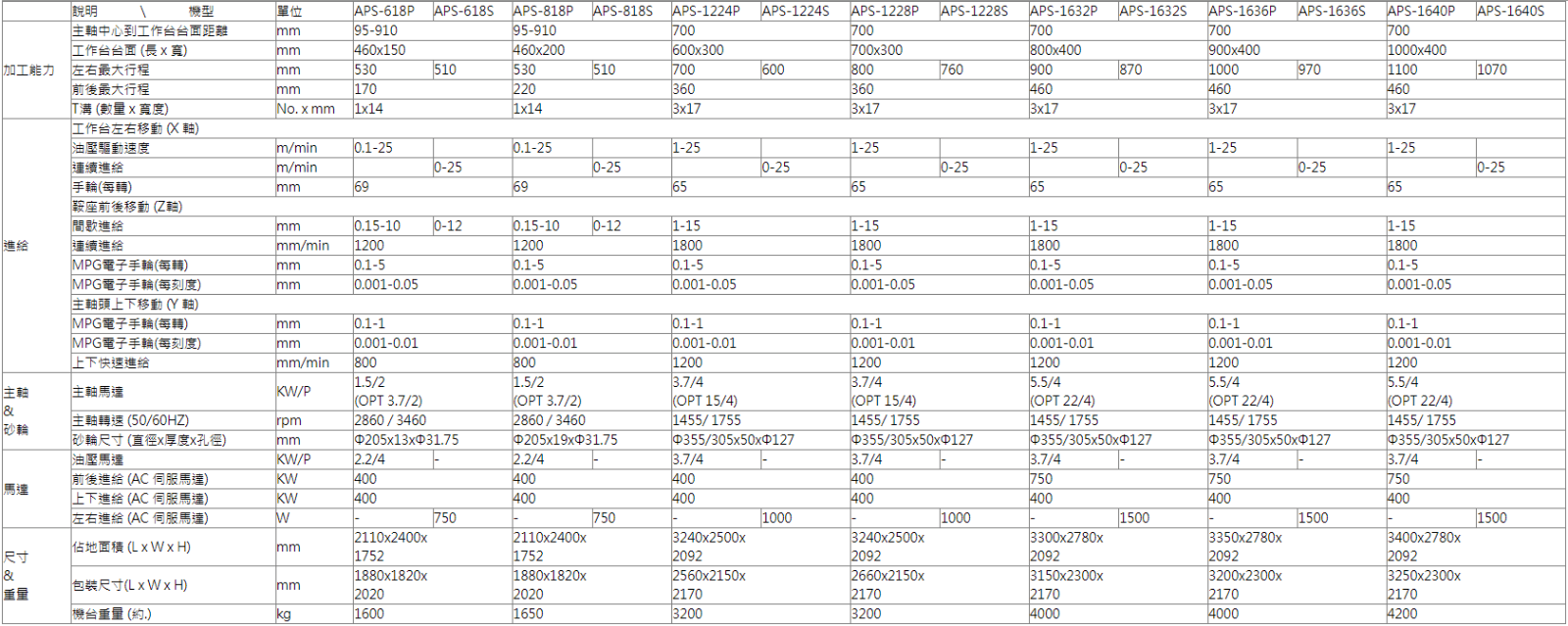 平面磨床鞍座系列全自動, 二-三軸伺服平面磨床APS-618 / 818 / 1224 / 1228 / 1632 / 1636 / 1640 P/S平面磨床工作台 (長 x 寬) /APS-618 P/S: 460mm x 150mmAPS-818 P/S: 460mm x 200mmAPS-1224/1228 P/S: 600/700mm x 300mmAPS-1632/1636/1640 P