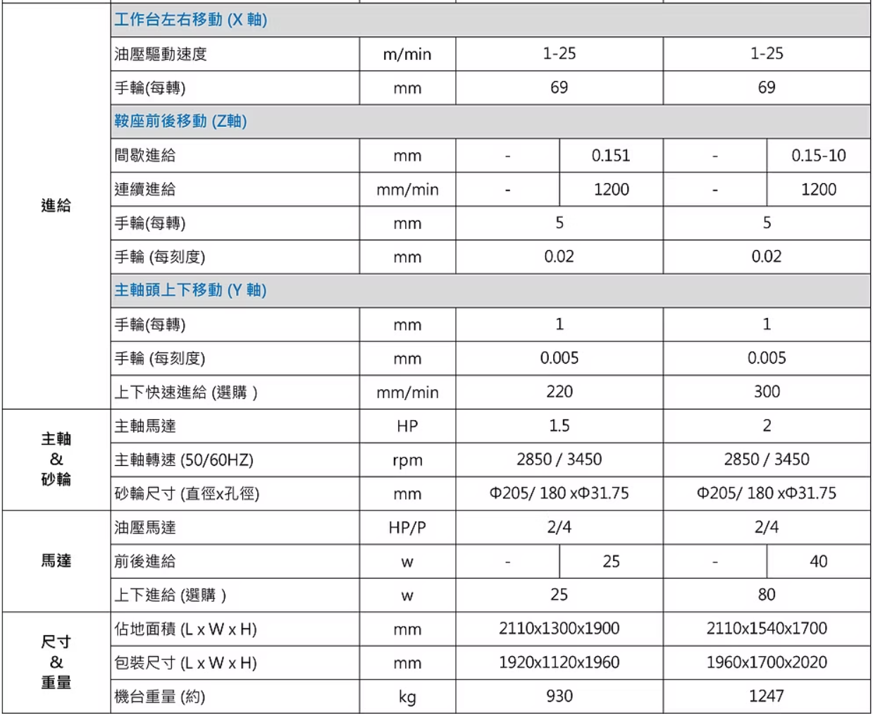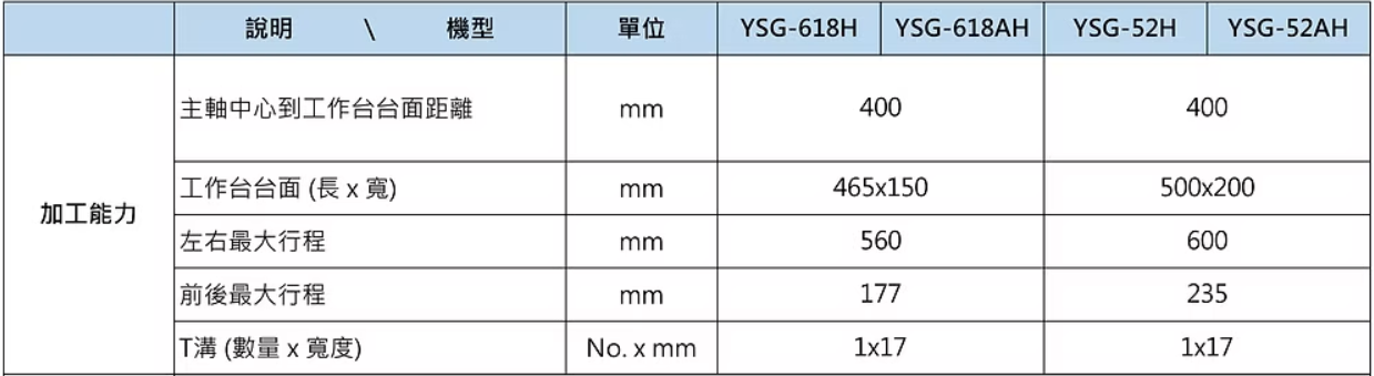 平面磨床鞍座系列半自動油壓系列YSG-618H/AH, YSG-52H/AH平面磨床工作台 (長 x 寬) /YSG-618H/AH: 465mm x 150mmYSG-52H/AH: 500mm x 200mm2HP V3級低震動主軸動馬達。精密主軸採套筒式, 軸承等級 ABEC Class 7 (P4) 軸承,0.003m/m TIR。618H/AH 主軸軸承前端使用1個滾柱軸承, 後端兩個斜