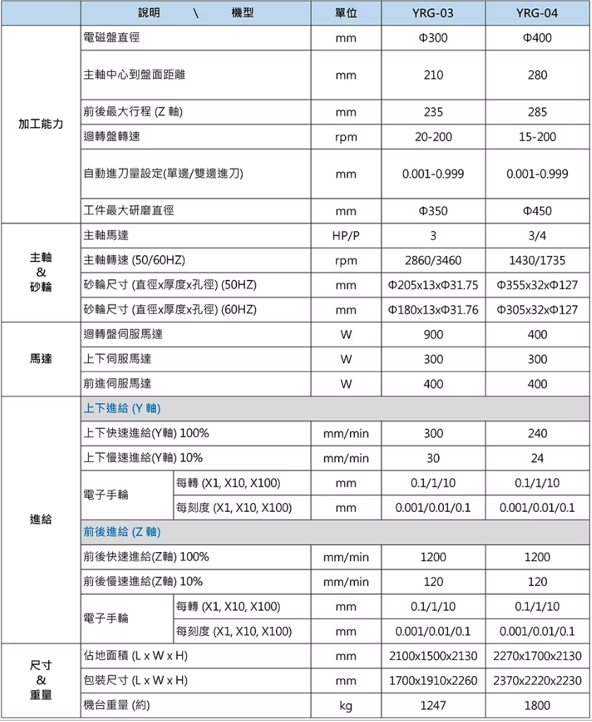圓盤式平面磨床系列鞍座系列平面磨床YRG-04平面磨床工作台 ( 外徑 ) /YRG-04: 400mmYRG-03: 300mm機台特點 /■ 精度迴轉盤面精度保證(試磨片x6片, 其高度差) : 2μ上下軸進刀精度最小單位 : 1μ■ 主軸及馬達上下軸採用AC伺服馬達驅動。3HP V3級主軸動平衡馬達。(YRG-03/04)精密主軸採直結式, ABEC Class 7 (P4) 軸承,0.00