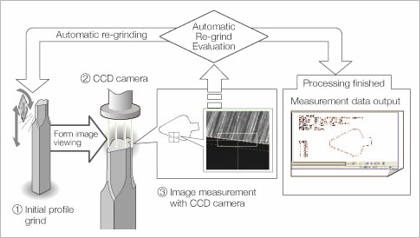 图解式曲线磨床DV-1是使用CCD相机实现自动在线测量和自动修整加工的最新数字机床。解决了以往使用投影仪时难以处理的品质不均、超微细工件加工、效率化等难题。
