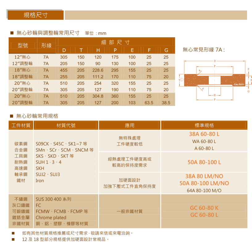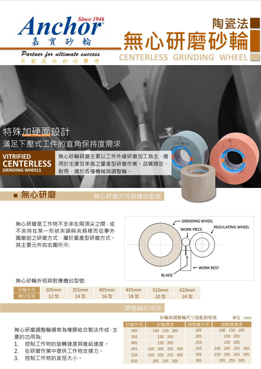 無心研磨砂輪及調整輪首頁/行業別砂輪產品/線性滑軌與滾珠螺桿業/無心研磨砂輪及調整輪產品描述無心研磨是工作物不支承在兩頂尖之間,或不夾持在某一形狀夾頭與夾具裡而從事外圓磨削之研磨方式。以磨削直形圓柱體工作物外圓表面為主,磨削效率高,泛用於研磨模具、軸承、事務機心軸、交通及運動器材等的心軸、軛銷、帶鉤螺栓。產品說明一、無心研磨砂輪:主要以工件外圓研磨加工為主,由於所加工外徑效率較高適用大量生產之研磨