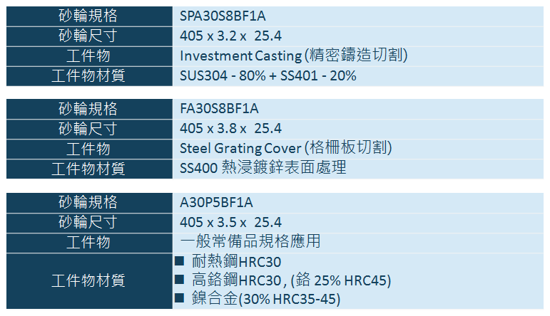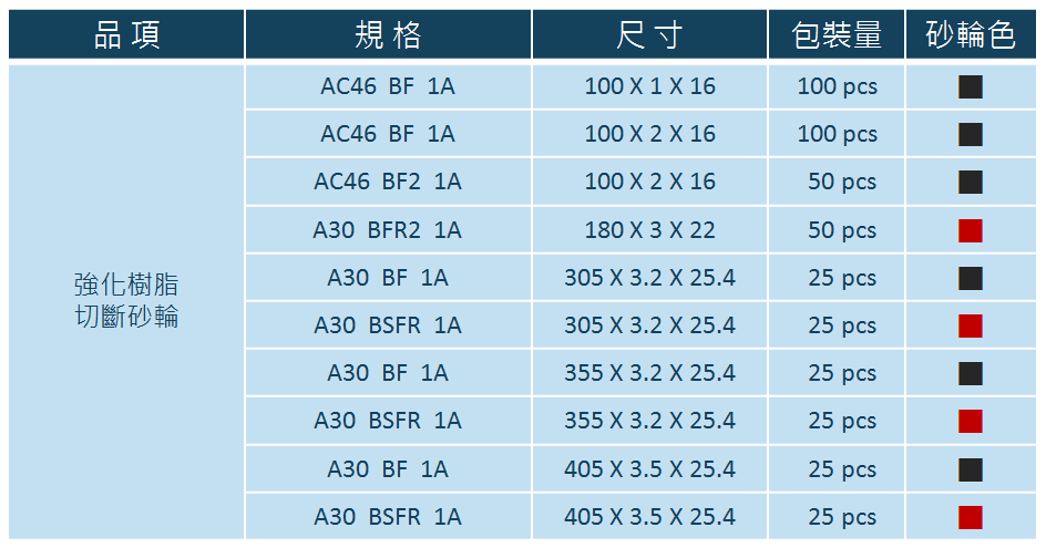 強化樹脂黏結切割砂輪首頁/行業別砂輪產品/線性滑軌與滾珠螺桿業/強化樹脂黏結切割砂輪產品描述切削銳利,內部夾覆特殊纖維網安全性高更耐用,泛用於切割一般鐵材、鋼材、銅材‧‧‧等。產品說明一、強化樹脂黏結切割砂輪使用纖維補強網作業安全性高二、使用切割砂輪可提升生產效率,達到最有效之經濟效益。三、切割精準、銳利、耐用性佳一般常見工件材質強化樹脂切斷及研磨砂輪粒度表嘉寶強化樹脂切斷片標準品規格尺寸*其他規