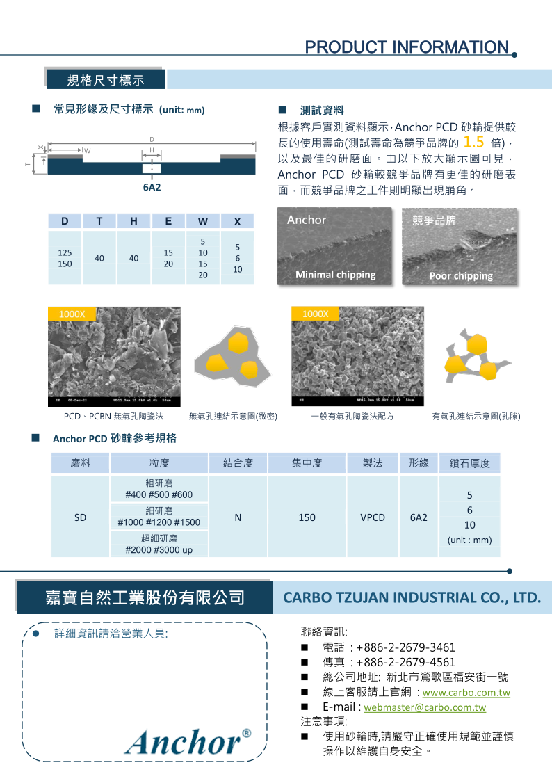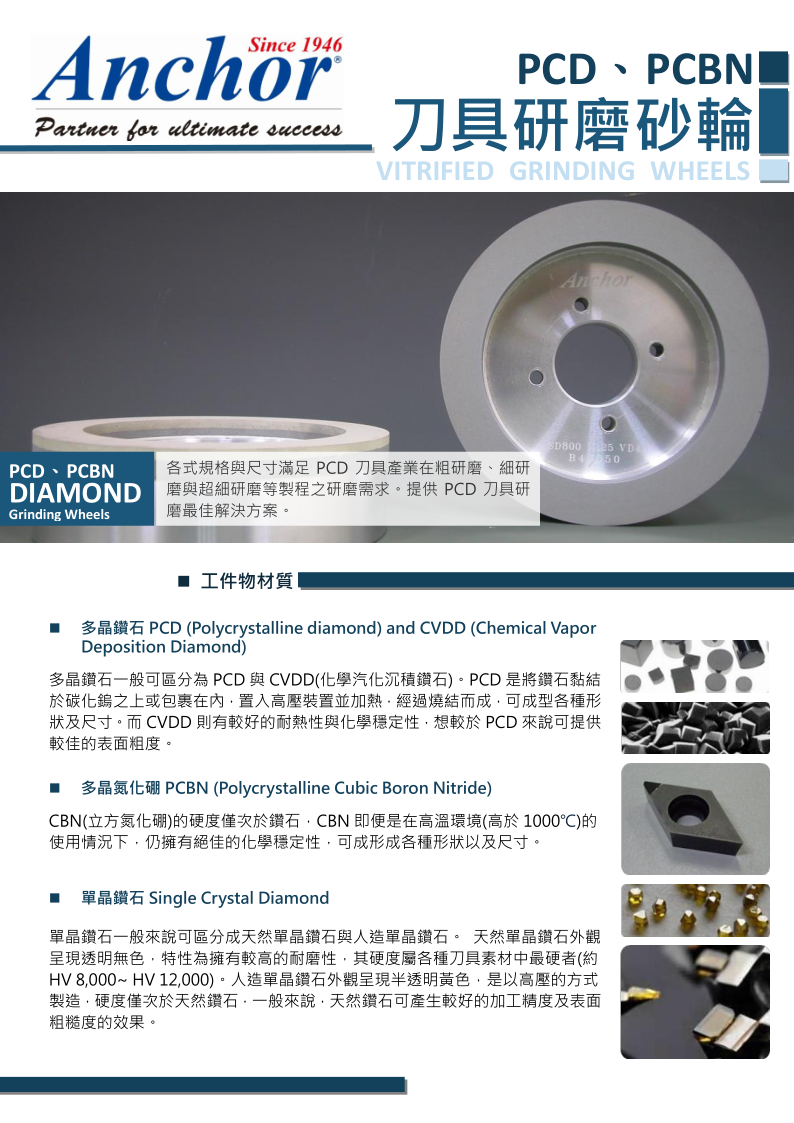 PCD及PCBN研磨用砂輪首頁/超級磨料產品群/瓷質法鑽石及CBN系列砂輪(V法)/PCD及PCBN研磨用砂輪產品描述PCD及PCBN研磨用砂輪採無氣孔陶瓷結合法製作,適合作為PCD以及PCBN人造超硬材料之精密研磨。產品說明嘉寶針對PCD與PCBN研磨製程需求,推出粗研磨(磨料粒度:#500~#800),細研磨(磨料粒度:#1000~#1500)以及超精細磨(磨料粒度:#2000以上)用砂輪。壽