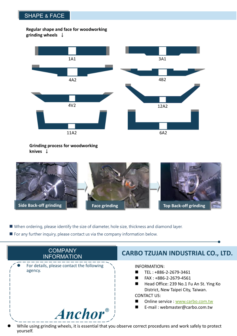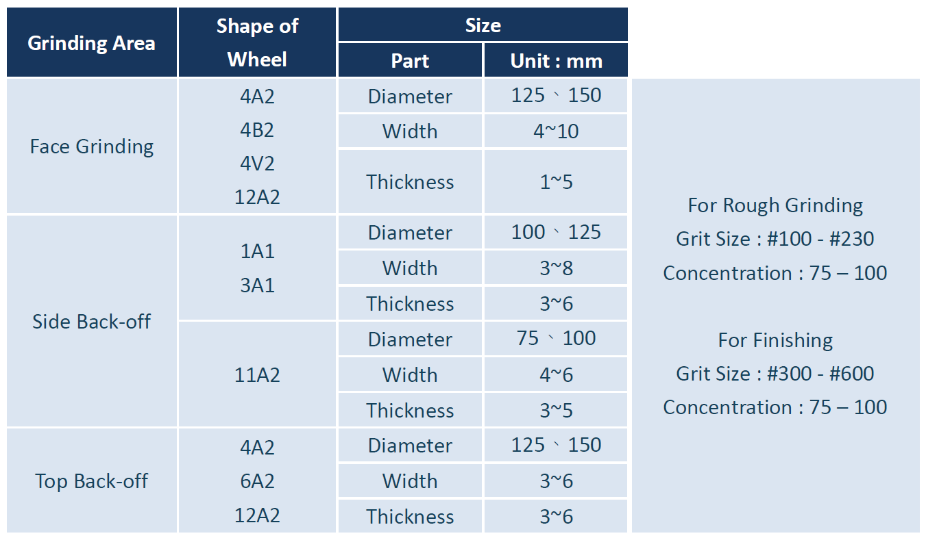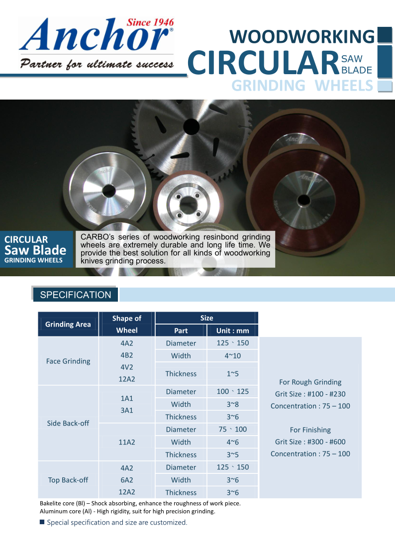 木工刀具研磨砂輪首頁/行業別砂輪產品/刀具業/木工刀具研磨砂輪產品描述適用於各類木材加工刀具之研磨及再研磨需求,如木工圓鋸及銑刀等。產品說明一、適用:木工刀具中之平鉋刀、成型刀、立銑刀、圓鋸片等研磨。二、砂輪規格:依新品刀具研磨及再研磨,在規格推薦有所不同。三、研磨要求不同砂輪基材分為:1.電木基材:吸震作用、減少砂輪磨耗、改善表面粗度。2.鋁合金基材:剛性較高、適合精度較高研磨。木工業砂輪常見規