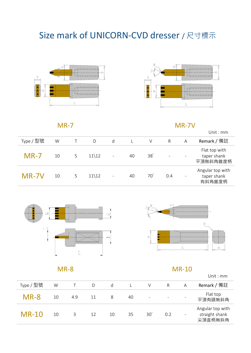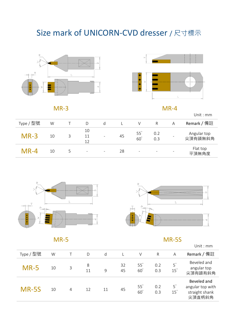 CVD修整工具首頁/超級磨料產品群/修整器/CVD修整工具產品描述可用於修整各種形狀及高精密的傳統氧化鋁、碳化矽砂輪,以及鑽石CBN超級磨料砂輪,廣泛的應用於精密加工研磨與成型研磨、斜進式外圓研磨等砂輪型狀修整,如齒輪業、線性滑軌、滾珠螺桿、培林業等等,提升修整效率,降低修整成本。產品說明嘉寶砂輪嚴選UNICORN系列CVD修整工具 –高效率、壽命長、最佳的CP值