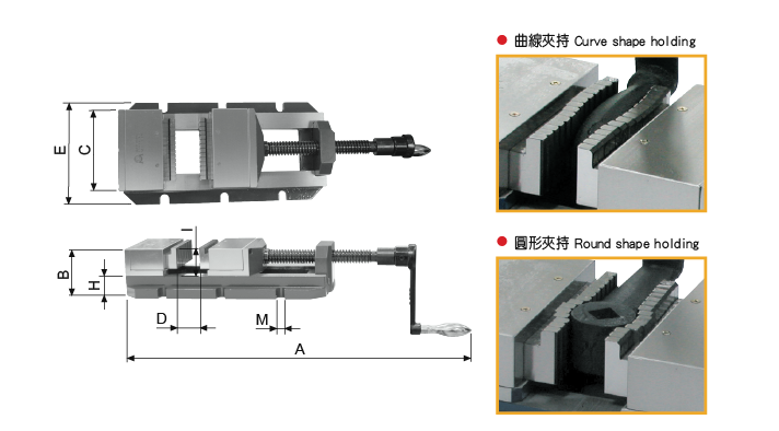 ● 特殊設計虎鉗口,可夾持任意外形如:圓形、曲線形、多邊形等。