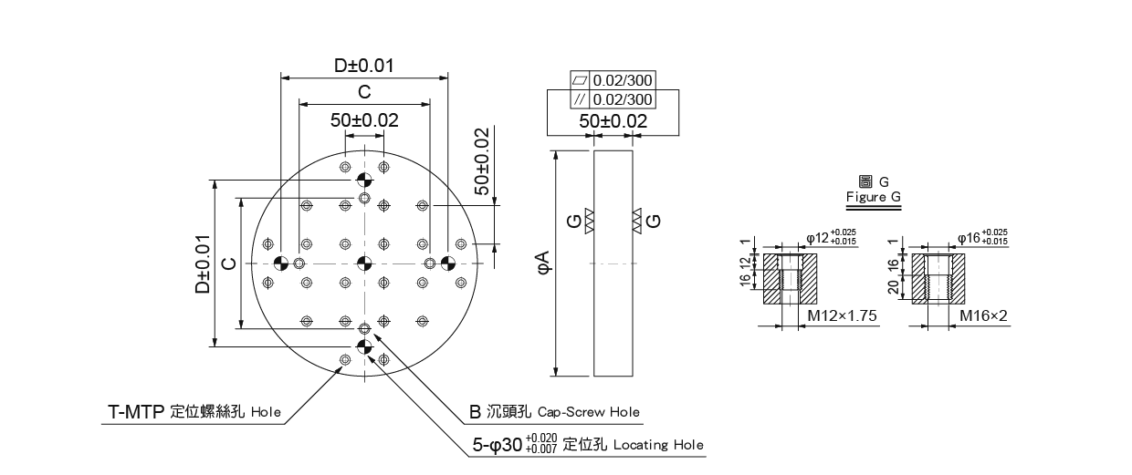 台湾米其林35370 圓形基板型号:BP17-50-0300-12 / BP17-50-0400-12 / BP17-50-0500-12 / BP17-50-0600-12 / BP17-50-0500-16 / BP17-50-0600-16●材質:FC30,熱處理:燒鈍。●適用於NC分度盤。●以孔定位方式,利用標準化治具零件,可快速組立完成一套符合需要之治具。單位:mm訂購編號型號ABCDG