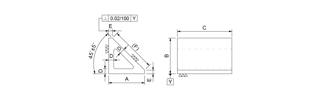 台湾米其林35583 45˚三角型治具型号:BC13-100100-150 / BC13-100100-300 / BC13-200200-150 / BC13-200200-300●材質:FC30,熱處理:燒鈍。單位:mm訂購編號型號ABCDEF重量 (kg)35583-05BC13-100100-15010010015014101274.535583-10BC13-100100-3001001