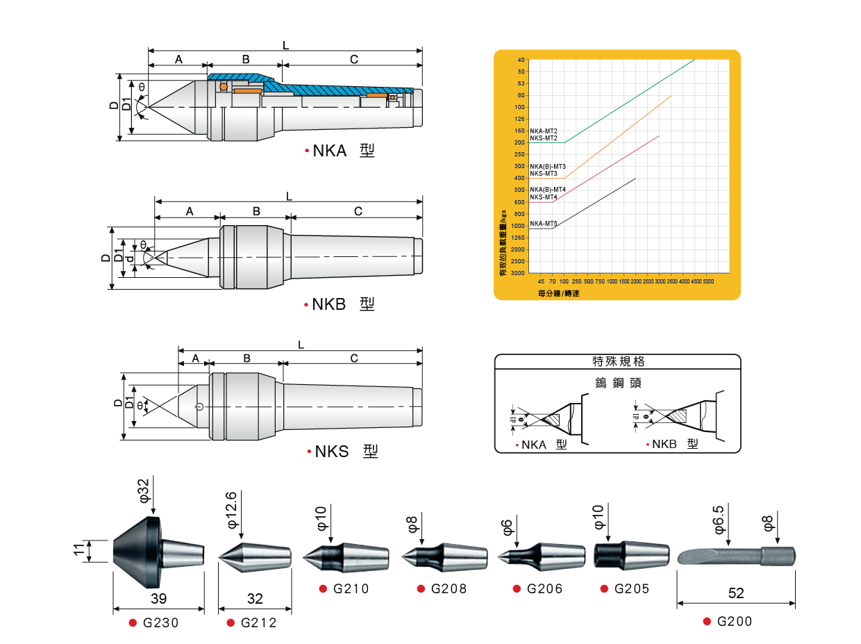 台湾米其林38515 迴轉頂針型号:NKA-MT2 / NKA-MT3 / NKA-MT4 / NKA-MT5 / NKB-MT3 / NKB-MT4 / NKS-MT2 / NKS-MT3 / NKS-MT4●適用中、高速之車床以及中負載使用。●心軸及本體使用軸承鋼之材質,經真空熱處理HRC60˚±1˚ 。●此頂針使用止推軸承,針狀軸承、滾針軸承及滾珠軸承之組合。●NKB型適合小型工作物之加工切