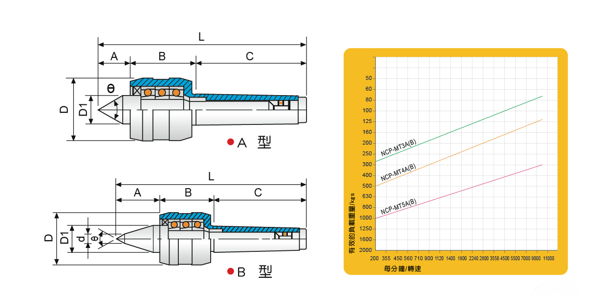 台湾米其林38521 超高速頂針NCP-B-TPYE型号:NCP-MT3A / NCP-MT4A / NCP-MT5A / NCP-MT3B / NCP-MT4B / NCP-MT5B●此頂針適用於CNC車床,具高轉速使用。●使用精密斜角滾珠軸承、滾針軸承及滾珠軸承之組合。●NCP-B型適合小型工作物之加工切削用。單位:mm訂購編號型號ABCDD1dLθ精度最高轉速 (RPM)重量 (kg)385