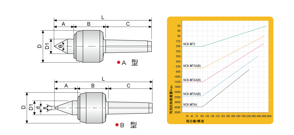 台湾米其林38522 高性能頂針型号:NCK-MT2A / NCK-MT3A / NCK-MT4A / NCK-MT5A / NCK-MT6A / NCK-MT3B / NCK-MT4B / NCK-MT5B●此頂針適用於CNC車床,具有防水性。●心軸使用合金工具鋼之材質,經真空熱處理HRC60˚±1˚ 具高剛性及耐磨性。●使用圓筒滾柱軸承、止推軸承及深溝滾珠軸承之組合。●NCK-B型適合小型工作