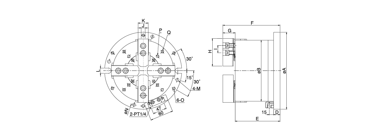 台湾米其林36052 內藏式中空(氣)油壓三爪夾盤型号:MO-04A / MO-05A / MO-06A / MO-08A / MO-10A / MO-12A●內藏式中空油壓夾盤適用於工作台面的鑽、銑加工而設計。●氣缸防鏽處理:在潮濕及工作環境較差的情況,氣缸內部經防鏽處理,部會生鏽或卡死。●防塵裝置:在工作檯上的鑽銑工作、切削及冷卻液不易進入夾盤內部,確保夾盤的使用壽命及精度。●內藏式油缸特性:
