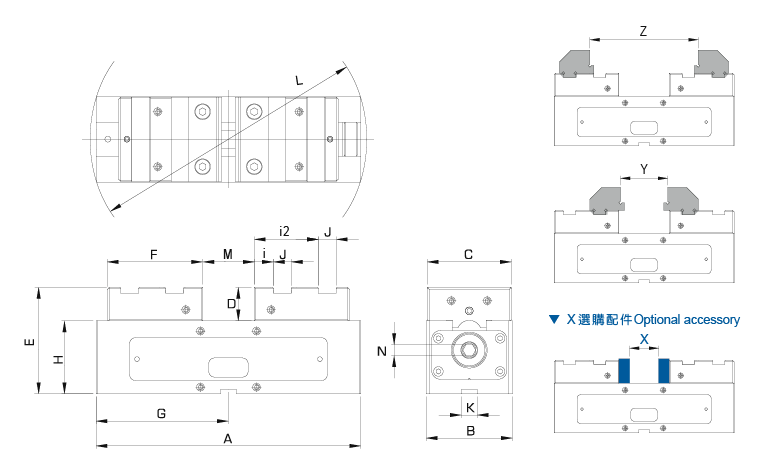 | 訂購編號 | 型號 | A | B | C | D | E | F | G | H | i | i2 | J | K | L | M | N | X | Y | Z | 夾持力 | 重量 (kg) |