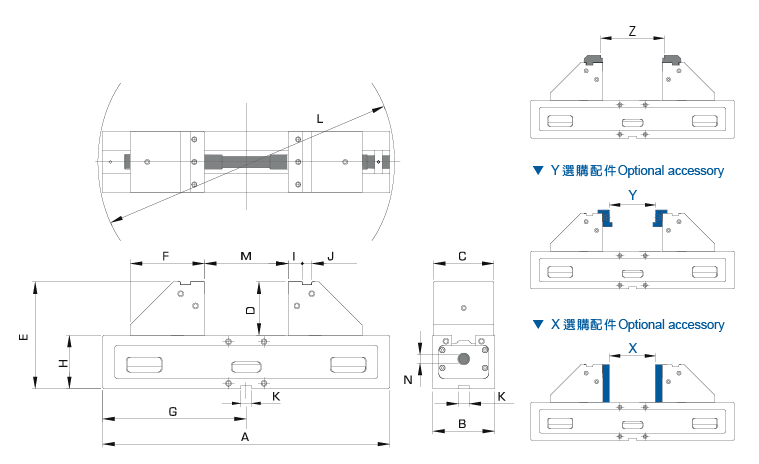 | 訂購編號 | 型號 | A | B | C | D | E | F | G | H | i | J | K | L | M | N | X | Y | Z | 夾持力 | 重量 (kg) |
