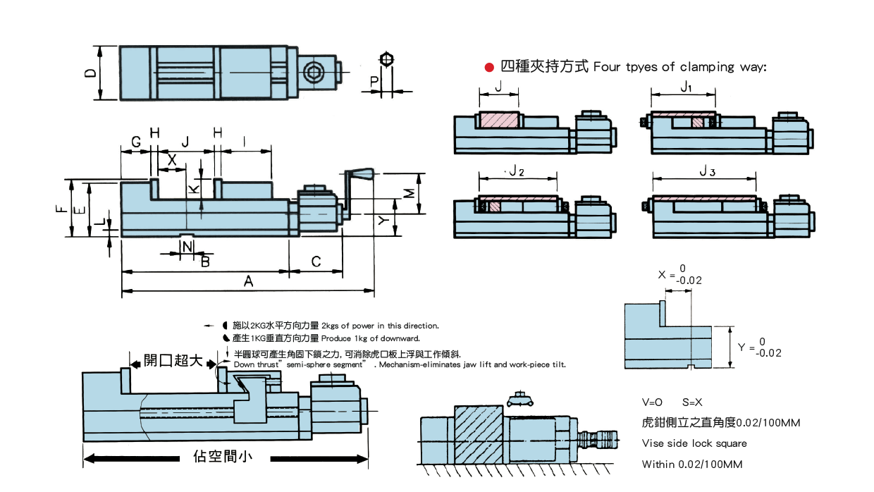 ● 角固式精密油壓虎鉗,適用立、臥式綜合切削加工機做重切削精密切削加工。