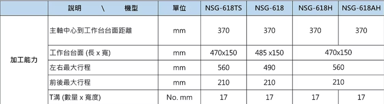 平面磨床鞍座系列鏡面研磨系列平面磨床NSG-618TS平面磨床工作台 (長 x 寬) /NSG-618 series: 470mm x 150mm機台特點 /■ 精度工作台面精度保證(試磨片x6片, 其高度差) : 2μ上下軸進刀最小單位 : 0.1μ■ 主軸及馬達上下軸採用AC伺服馬達驅動2HP V3級低震動主軸動馬達精密主軸採直結式, ABEC Class 7 (P4) 軸承,0.003m/m