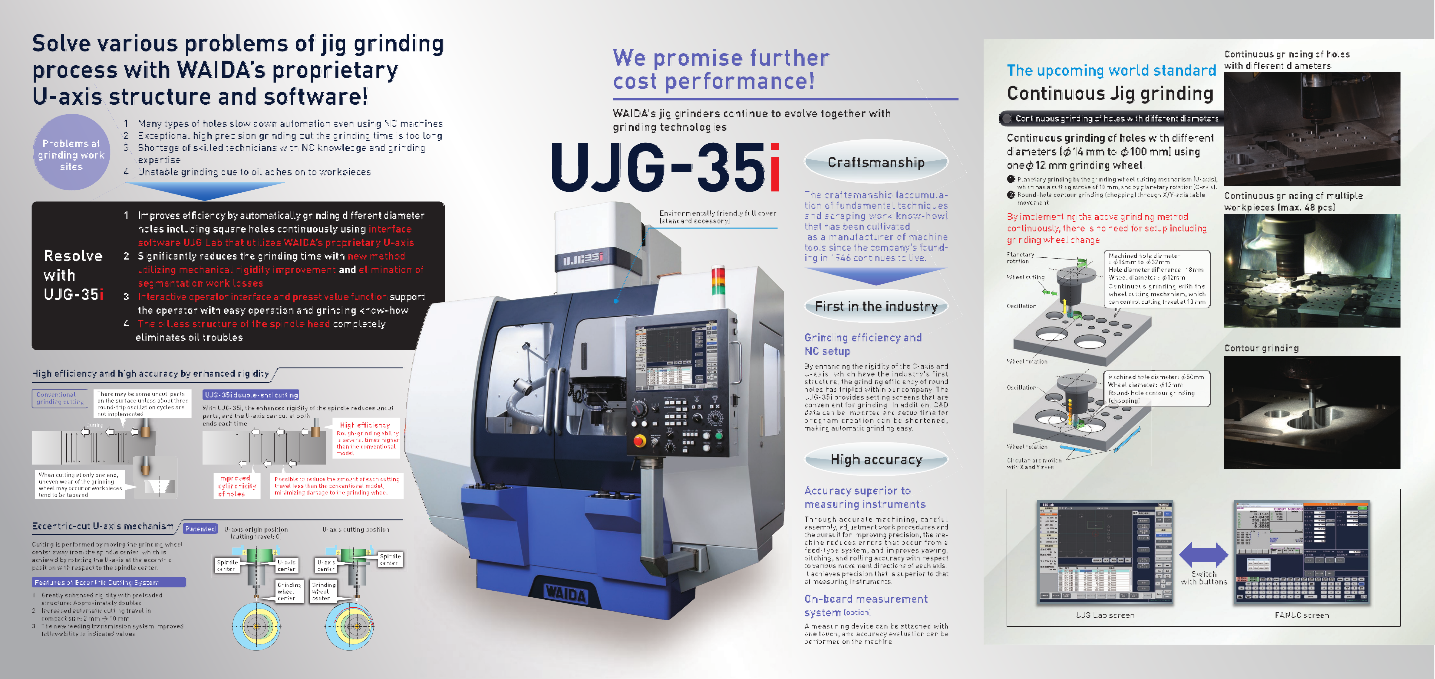 坐標磨床UJG-35i搭載了接口軟件“UJG Lab”的智能坐標坐標磨床,同時保留了傳統機器(UJG-35)的功能。用途精密精密模板、精密零件、夾具等的孔和輪廓加工。材料硬質合金,工具鋼等自動偏心切割U軸機構(專利)實現高精度加工,顯著減少加工時間,擴展連續無人操作。可以通過推薦值設定功能等簡單的操作來創建加工程式。以圖形方式顯示工件形狀以提供直觀的操作幫助通過讀取DXF數據創建加工程式具有高間距