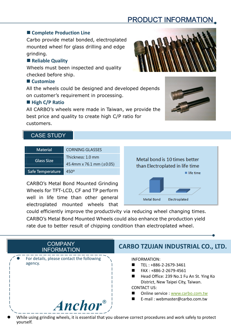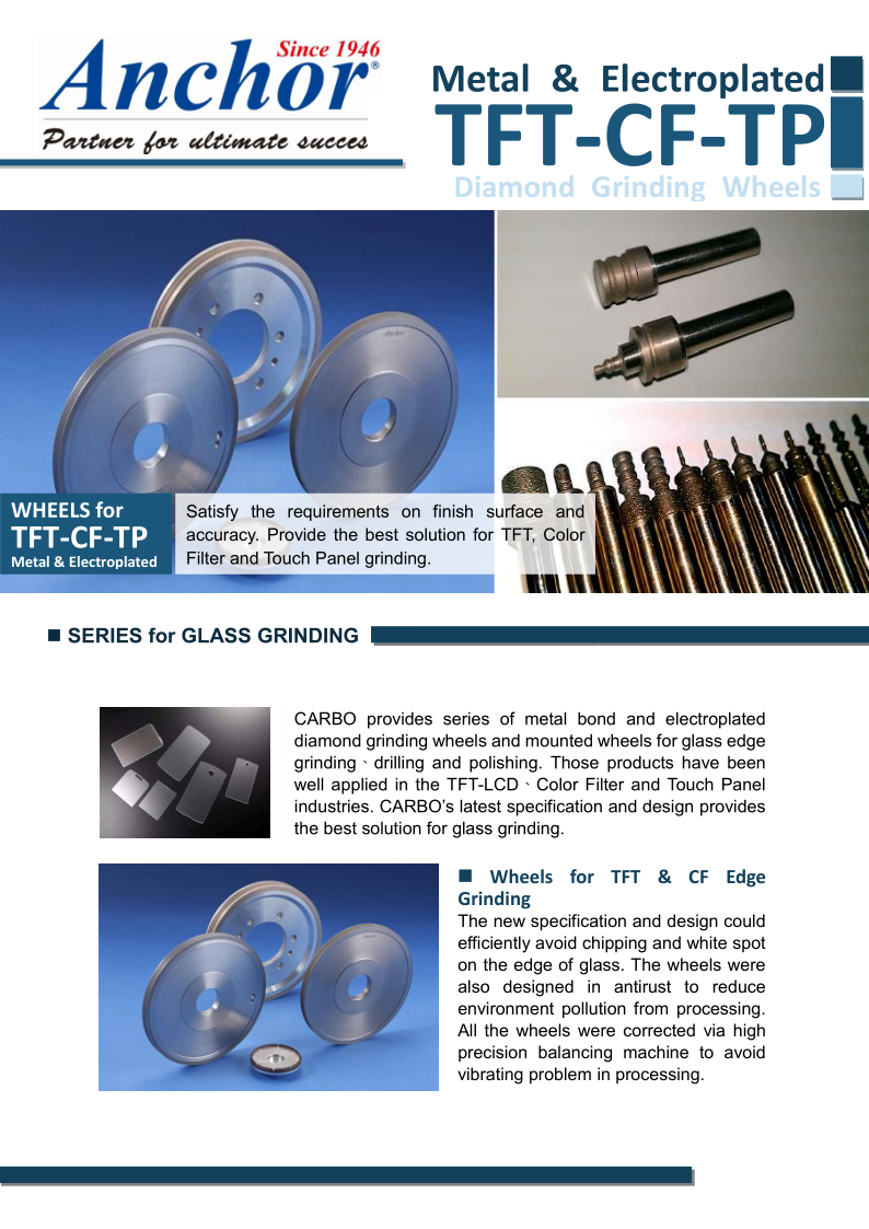 液晶顯示器面板玻璃研磨砂輪首頁/行業別砂輪產品/玻璃加工業/液晶顯示器面板玻璃研磨砂輪產品描述金屬結合劑製法之砂輪角度不易變形及產品壽命長,適合液晶顯示器玻璃基板之精密R角成型加工。樹脂結合劑製法可獲得較佳的研磨面粗度表現。產品說明一、用於玻璃基材(glass substrate)、彩色濾光片(color filter) 、液晶模組(LCM)上玻璃的磨邊倒角加工效率高液晶面板加工專用結合劑,與鑽石