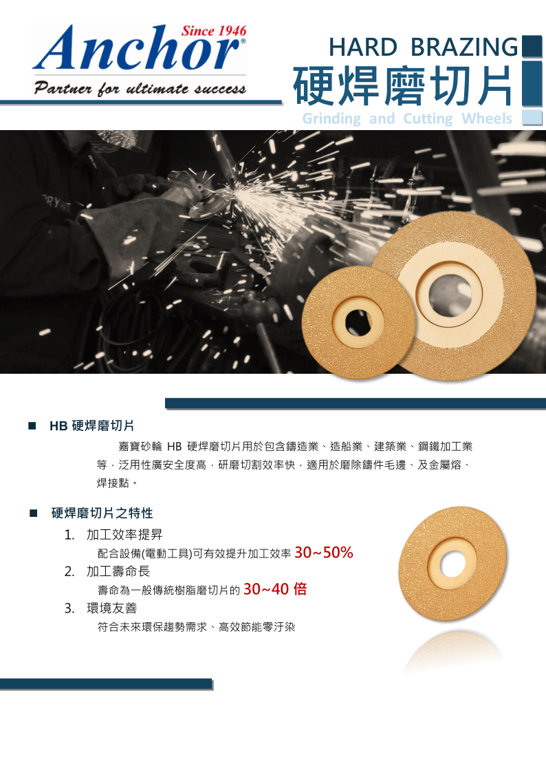 HB硬焊砂輪首頁/行業別砂輪產品/鑄造業/HB硬焊砂輪產品描述嘉寶砂輪HB硬焊磨切片用於包含鑄造業、造船業、建築業、鋼鐵加工業等,泛用性廣安全度高,研磨切割效率快,適用於磨除鑄件毛邊、及金屬熔、焊接點。產品說明硬焊磨切片之特性加工效率提昇 配合設備(電動工具)可有效提升加工效率30~50%加工壽命長 壽命為一般傳統樹脂磨切片的30~40倍環境友善 符合未來環保趨勢需求、高效節能零汙染HB硬焊砂輪標