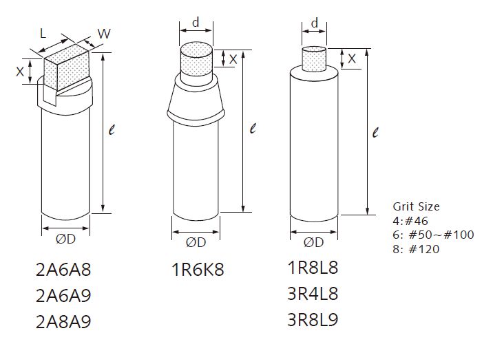 CVD成型修刀 尺寸單位:mm 規格 D L 鑽石角度 料號 804-2Z 10 50 V55° R0.3 DKL2Q001B 804-2Z 12 50 V55° R0.3 DKL3Q001B 804-3Z 10 50 V55° R0.3 DKL2Q002B 804-3Z 12 50 V55° R0.3 DKL3Q002B 1204-1Z 9.5 50 V60° R0.2 DKL5U004B CVD成型修刀選用推薦表 尺寸單位:mm 砂輪厚度 砂輪外徑 100 150 250 255 305 355 405 13 1Z 1Z 2Z 2Z 3Z 3Z 3Z 25 1Z 2Z 2Z 3Z 3Z 3Z 38 2Z 2Z 3Z 3Z 3Z 3Z 50 2Z 3Z 3Z 3Z 3Z 65 3Z 3Z 3Z 3Z 3Z 75 3Z 3Z